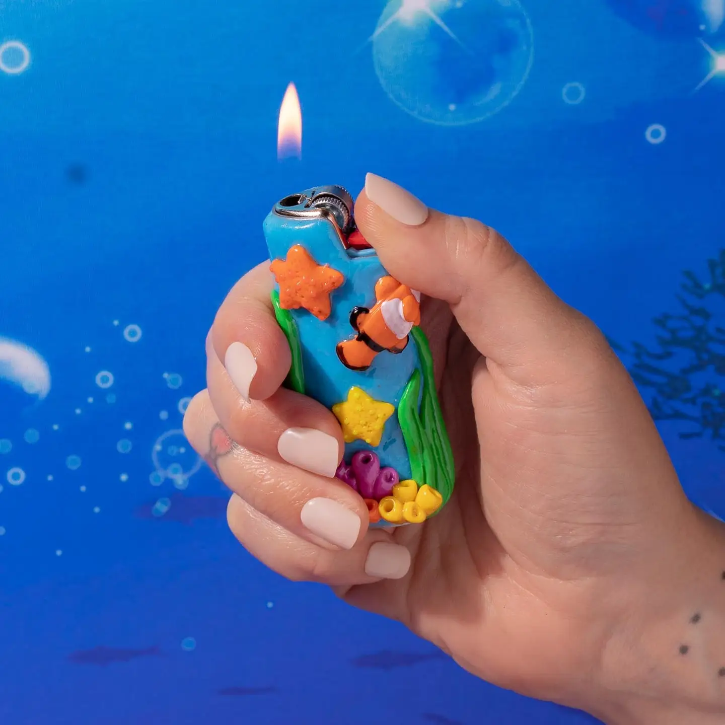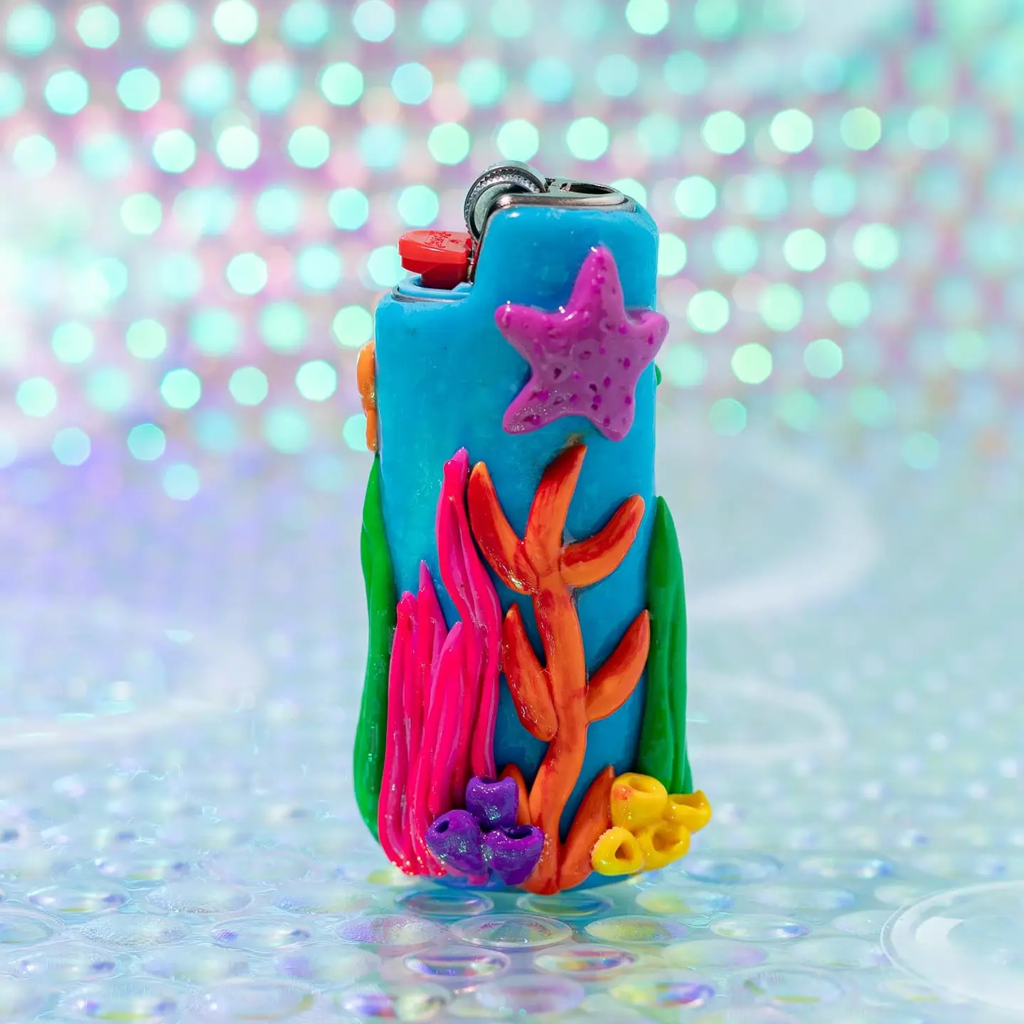 * Metal lighter case covered in clay details, featuring an ocean scene