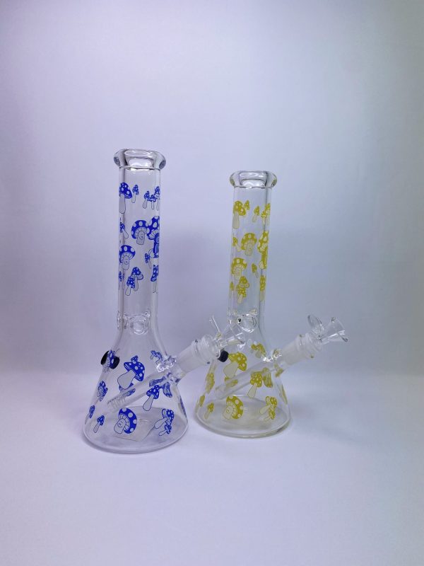 This Billy Mate Rainbow Mushrooms Beaker bong comes with a diffused stem, ice catcher and glass cone piece. It also glows in the dark.